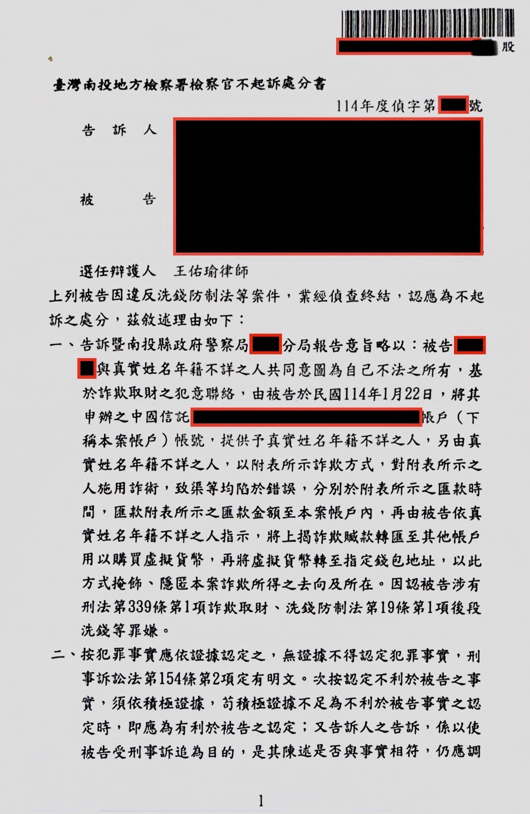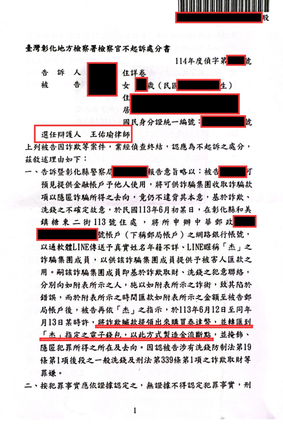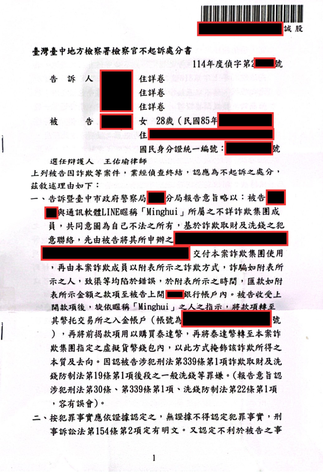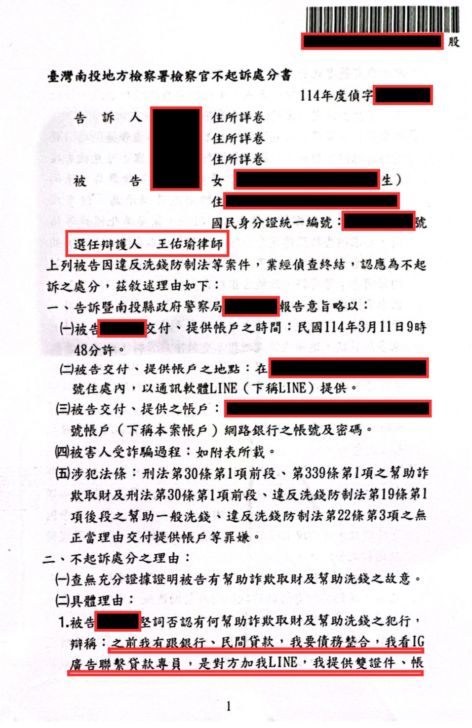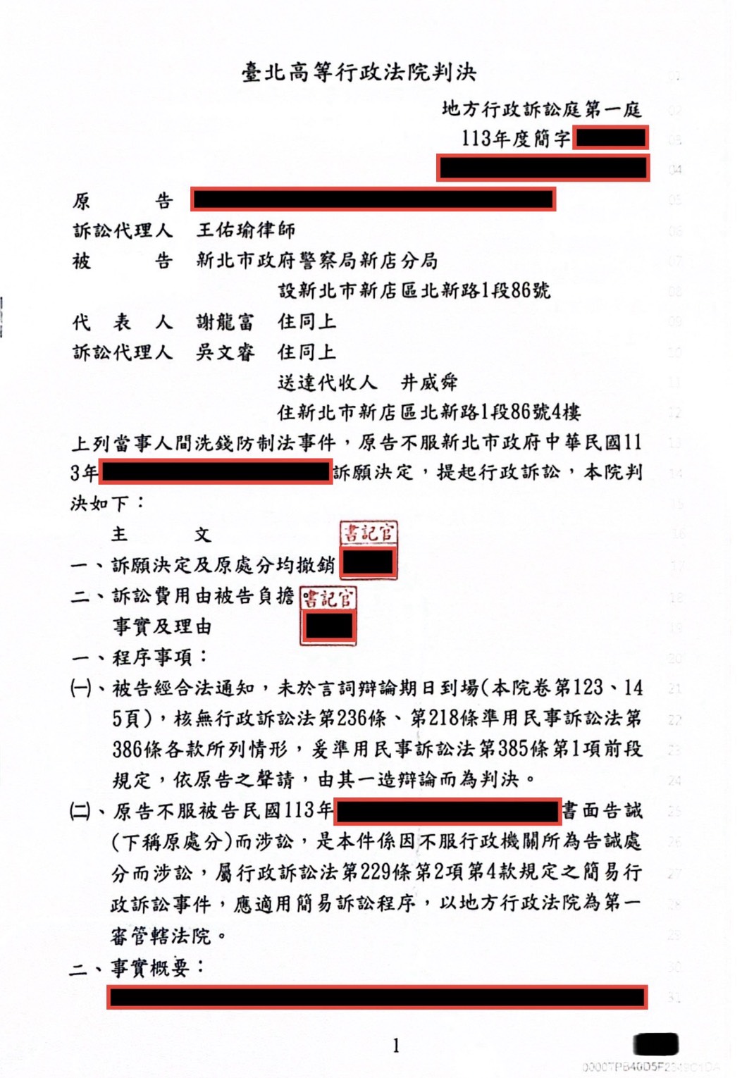 當事人在IG上看到投資理財廣告,因為好奇而主動聯繫詐騙集團,後來在出金過程中收到贓款(其他被害人被騙的錢),刑事責任雖然順利不起訴,但被警方開了告誡,訴願後仍被市政府駁回。